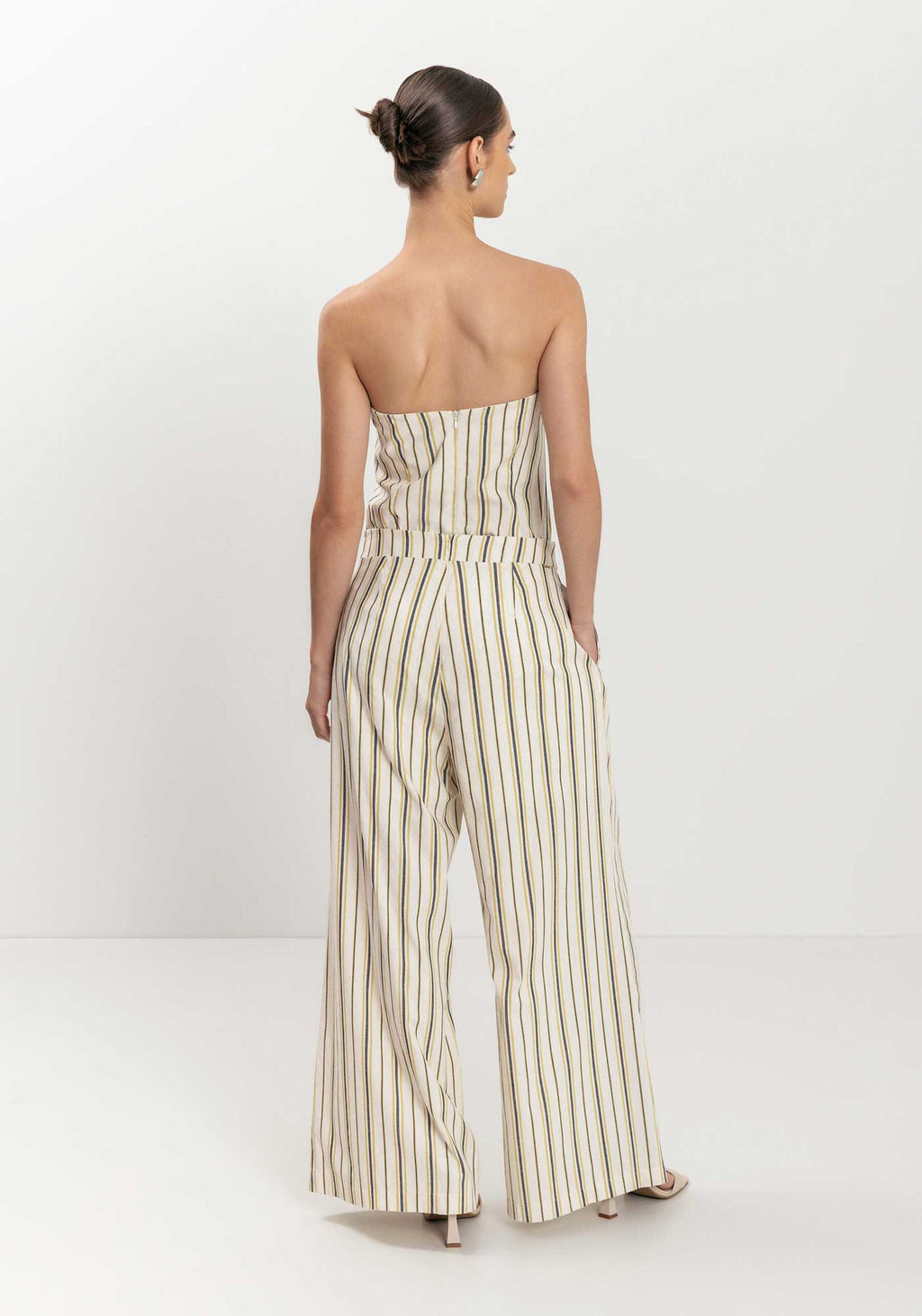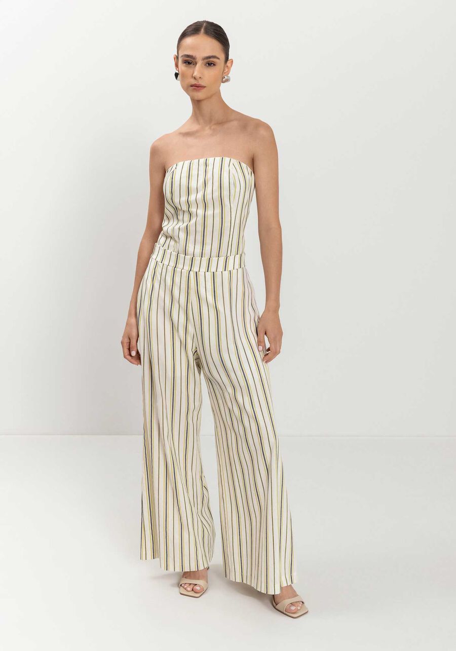 Com a leveza do linho e a elegância das listras, esta calça pantalona é ideal para quem busca conforto e sofisticação. A cintura alta e os bolsos laterais completam o look com um toque prático e estiloso. Feita em tecido com linho leve, padronagem listrada construída em tear, modelagem pantalona, cintura alta, bolsos laterais e fechamento por zíper. COMPOSIÇÃO: CORPO 52%ALGODÃO 39%VISCOSE 9%LINHO FORRO 100% VISCOSE